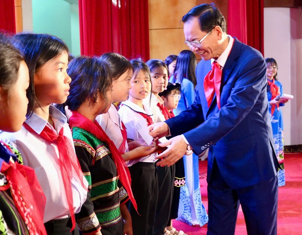 Đồng chí Lưu Văn Trung, Phó Bí thư thường trực Tỉnh ủy, Chủ tịch HĐND tỉnh Đắk Nông trao học bổng cho các em thiếu nhi