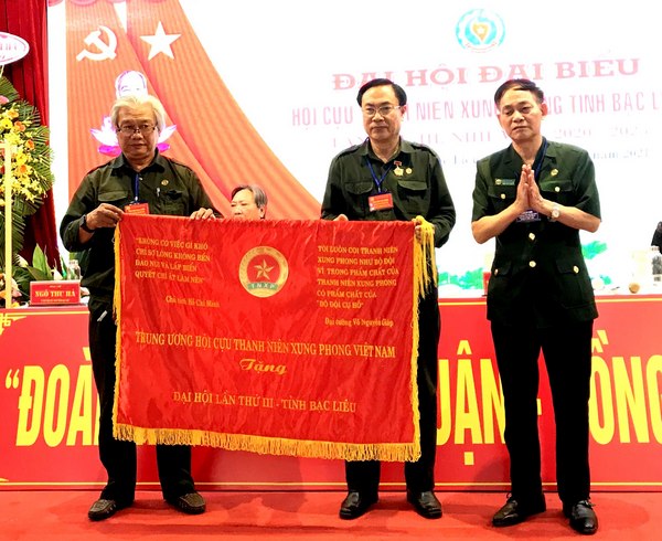 Đồng chí Ngô Văn Tuyến - Ủy viên Thường trực Đoàn Chủ tịch Trung ương Hội Cựu TNXP Việt Nam trao Bức trướng cho Hội Cựu TNXP tỉnh Bạc Liêu tại Đại hội