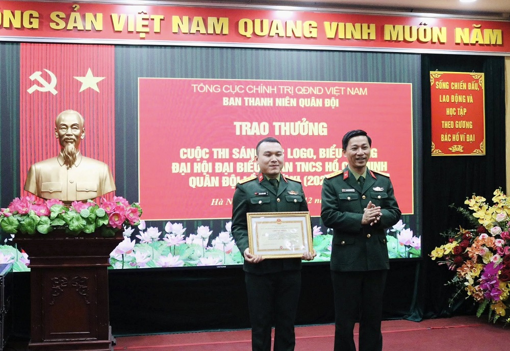 Trưởng ban Thanh niên Quân đội Nguyễn Quang Huy trao giải Nhất cho đại diện nhóm tác giả của Tổng cục Hậu cần - Kỹ thuật đoạt giải sáng tác logo biểu trưng của Đại hội