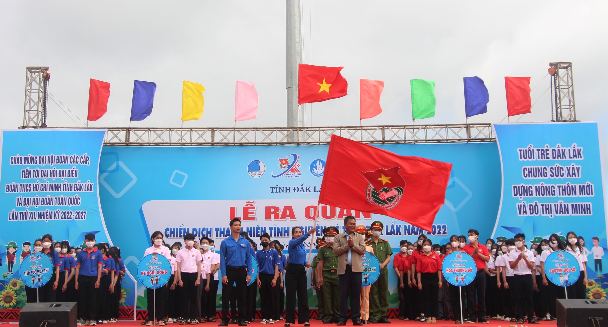 Phó Bí thư Tỉnh ủy Y Biêr Niê trao cờ xuất quân cho Thường trực Tỉnh đoàn và các đội hình tham gia Chiến dịch thanh niên tình nguyện hè năm 2022