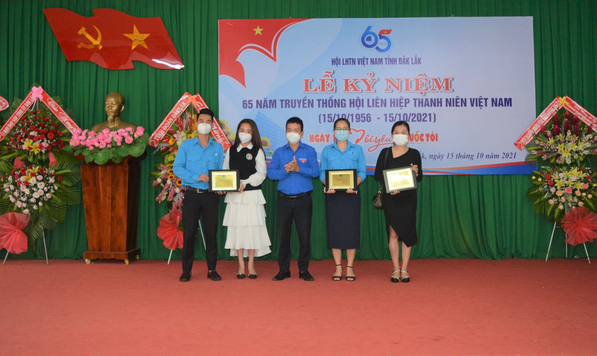 Để ghi nhận thành tích của các tập thể, cá nhân trên các lĩnh vực, Trung ương Hội Liên hiệp Thanh niên Việt Nam trao tặng Giải thưởng 15/10 cho 02 cá nhân và tặng Bằng khen cho 04 cá nhân có thành tích xuất sắc trong phong trào “Tôi yêu Tổ quốc tôi năm 2021”; Ủy ban Hội Liên hiệp Thanh niên Việt Nam tỉnh tuyên dương 68 cá nhân, tập thể tiêu biểu trên các lĩnh vực: 13 cán bộ hội tiêu biểu, 25 thanh niên sống đẹp, 13 gia đình trẻ tiêu biểu, 06 thanh niên khởi nghiệp tiêu biểu, 13 câu lạc bộ đội nhóm tiêu biểu. Đồng thời, trao 04 suất vốn khởi nghiệp trị giá 20 triệu đống/1 suất cho 04 thanh niên của huyện Krông Pắk, huyện Cư kuin, huyện M’drắk, thành phố Buôn Ma Thuột.
