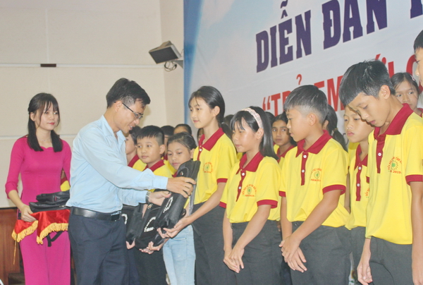 Tặng quà cho các em thiếu nhi tham gia diễn đàn |