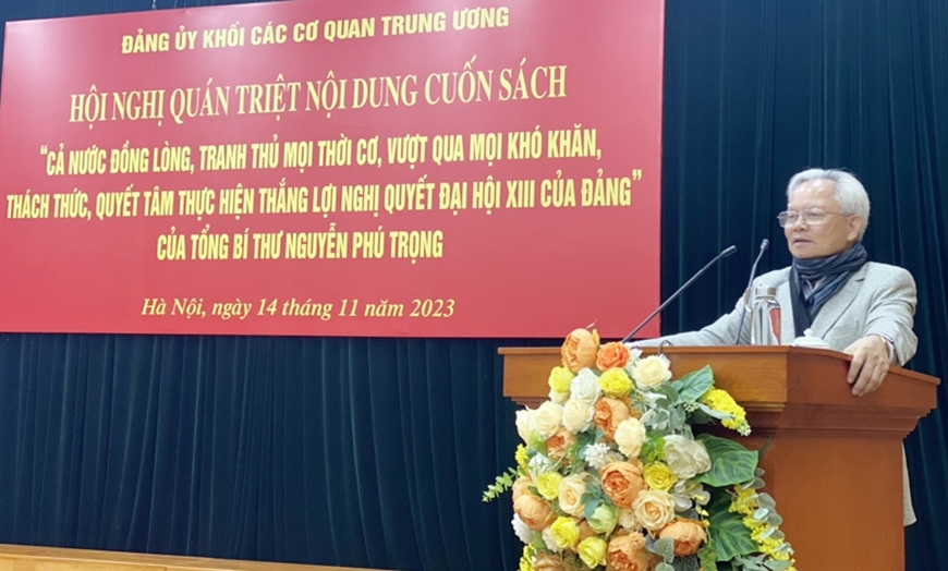 Tại Hội nghị, nguyên Ủy viên Trung ương Đảng, nguyên Giám đốc Học viện Chính trị Quốc gia Hồ Chí Minh, GS, TS Tạ Ngọc Tấn, Phó chủ tịch Thường trực Hội đồng Lý luận Trung ương giới thiệu những nội dung của cuốn sách “Cả nước đồng lòng, tranh thủ mọi thời cơ, vượt qua mọi khó khăn, thách thức; quyết tâm thực hiện thắng lợi Nghị quyết Đại hội XIII của Đảng”.