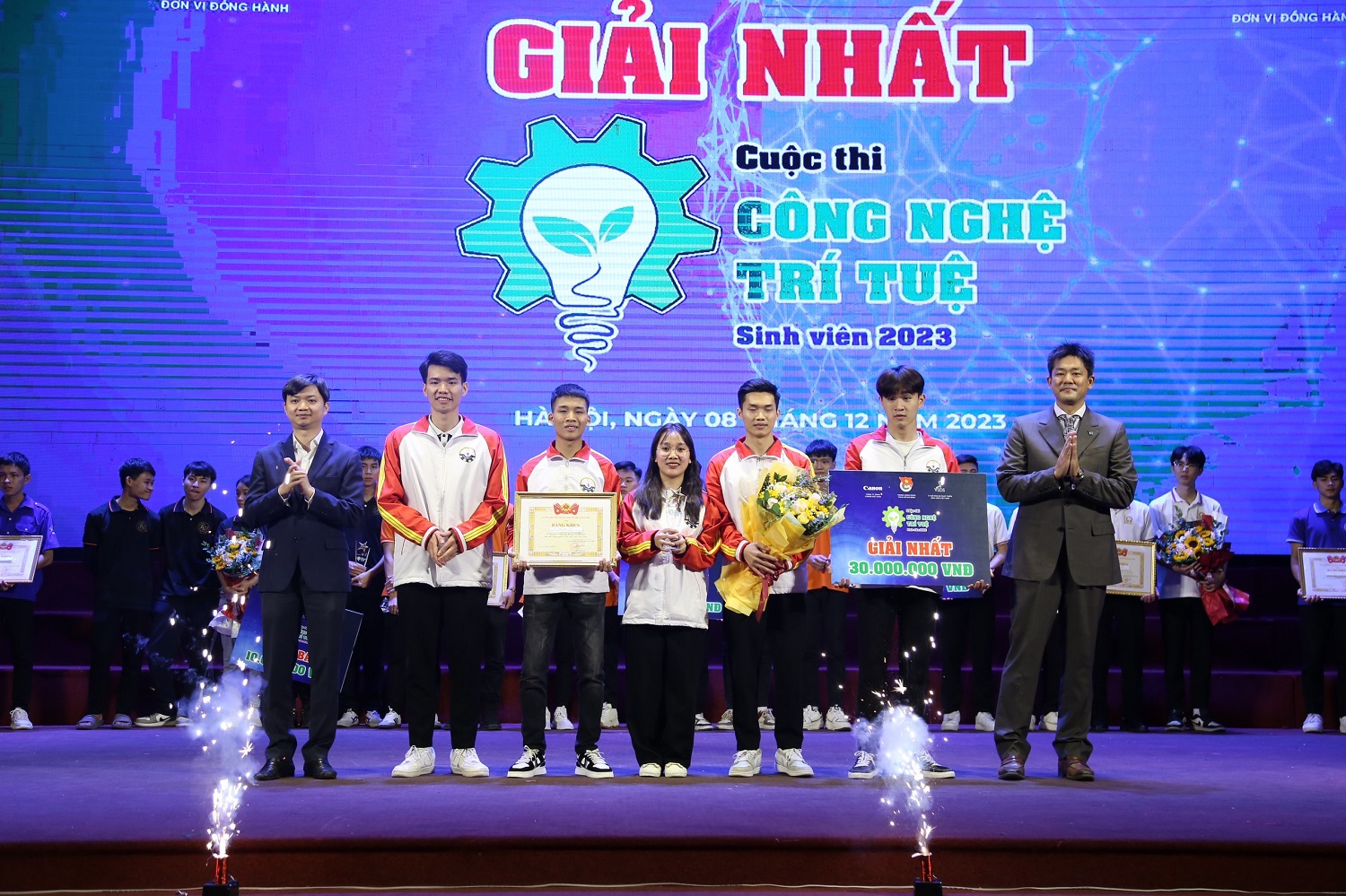 Đồng chí Nguyễn Minh Triết- Bí thư T.Ư Đoàn, Chủ tịch Hội SVVN  và ông Yohei Edagawa, Giám đốc Bộ phận Công nghệ Sản xuất, Công ty TNHH Canon Việt Nam trao giải Nhất cho đội MEET 2-TNUT (trường ĐH Kỹ thuật Công nghiệp, ĐH Thái Nguyên)