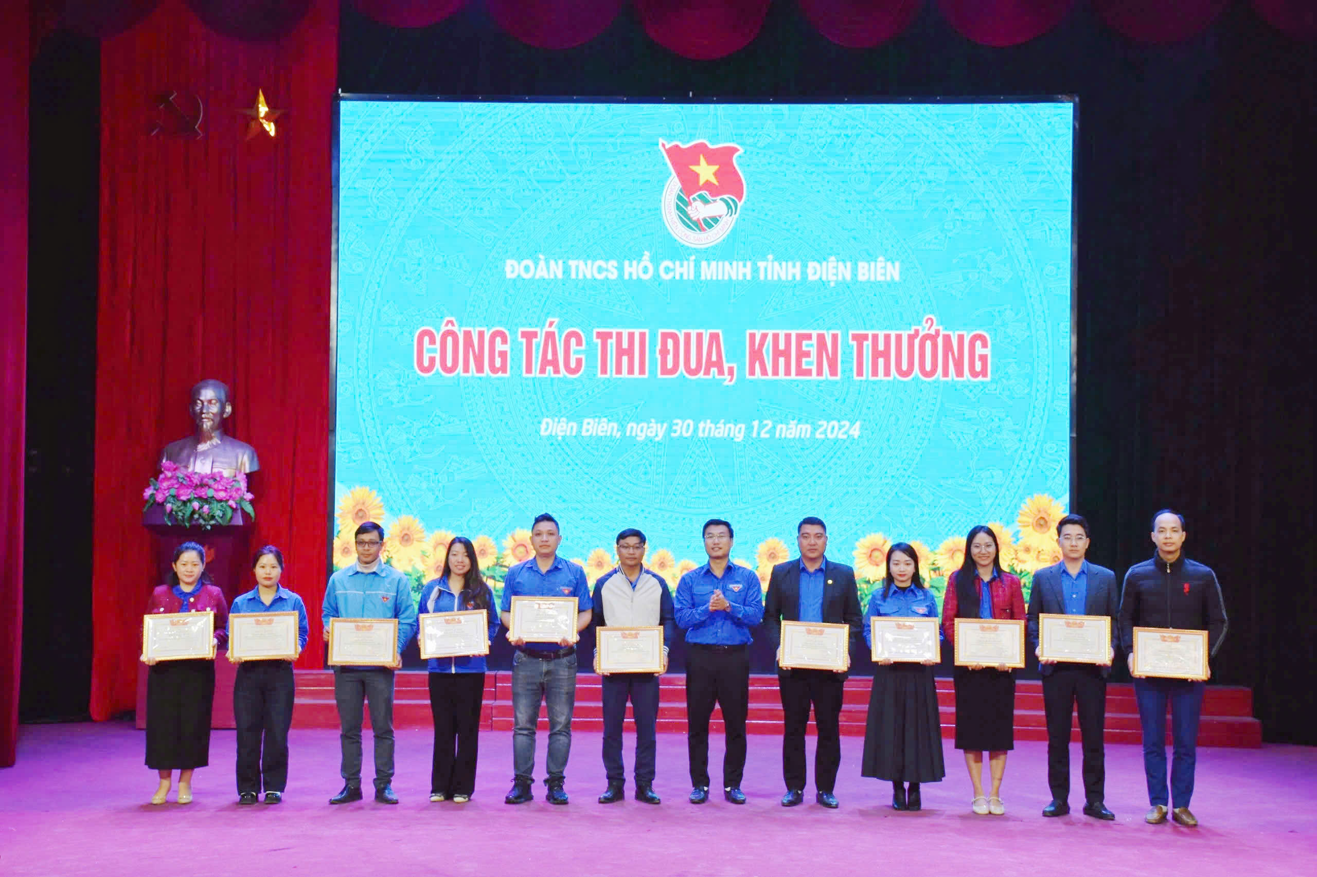 Dịp này, Ban Chấp hành Tỉnh đoàn đã trao cờ thi đua cho 01 tập thể đạt danh hiệu xuất sắc dẫn đầu cụm thi đua trong công tác đoàn và phong trào thanh thiếu nhi năm 2024; tặng bằng khen xuất sắc cho 02 đơn vị trong công tác đoàn và phong trào thanh thiếu nhi năm 2024; tặng bằng khen đơn vị tiên tiến cho 06 đơn vị trong công tác đoàn và phong trào thanh thiếu nhi năm 2024; tặng Bằng khen cho các tập thể, cá nhân cấp cơ sở có thành tích xuất sắc trong năm 2024; ” và tặng quà cho đồng chí Ủy viên Ban Chấp hành, Ủy viên Ban Thường vụ chuyển công tác trong năm 2024.