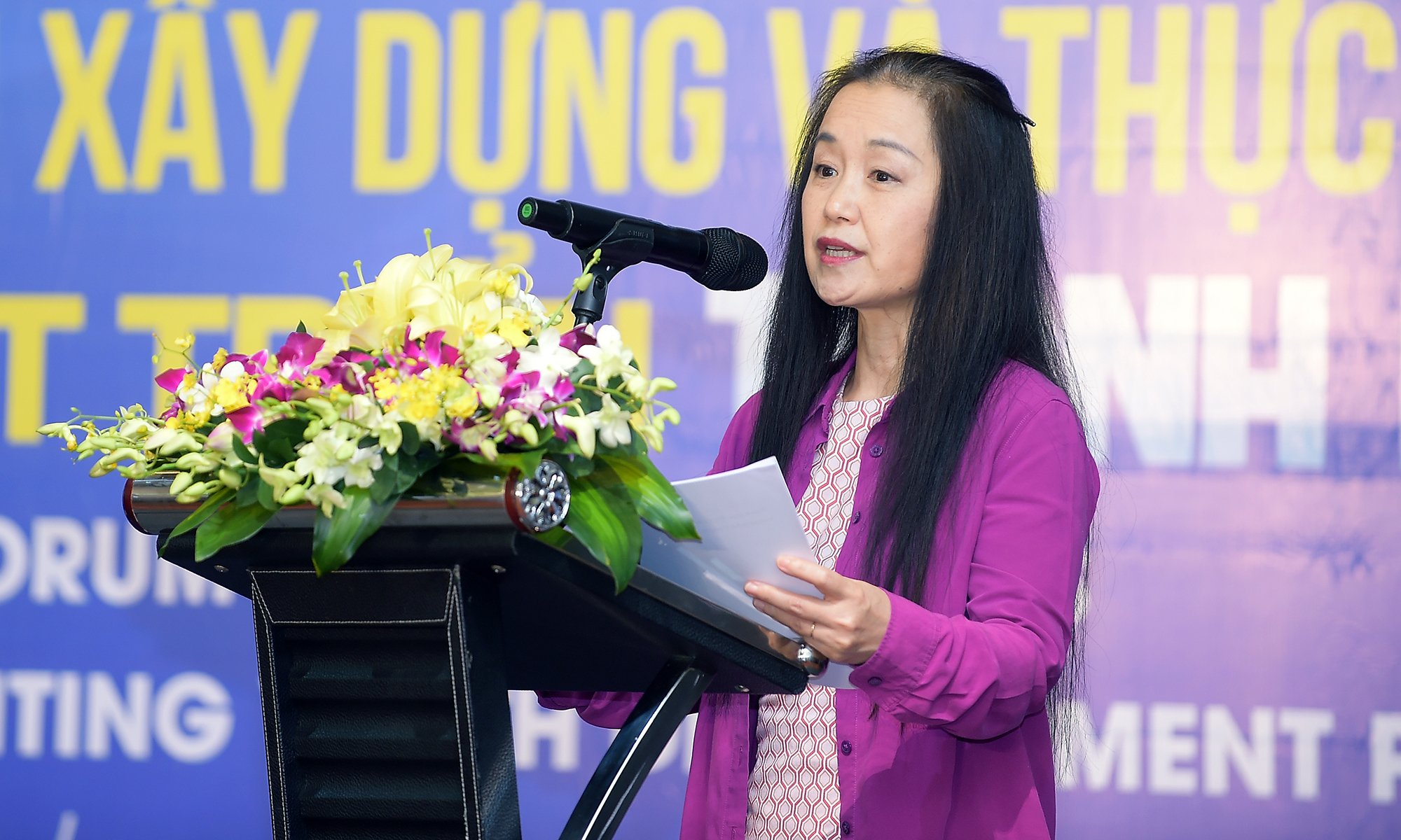 Bà Phan Thu Hiền - đại diện tổ chức Plan International Việt Nam trình bày tham luận trực tiếp tại Diễn đàn.