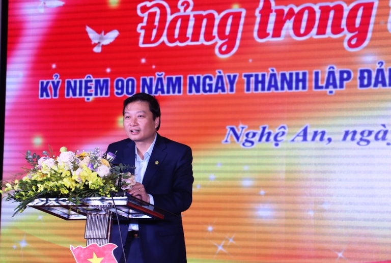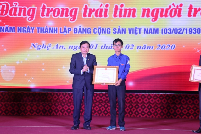 Tại chương trình này, nhằm động viên khích lệ và biểu dương thành tích của em Đậu Huy Minh - Học sinh lớp 12A2, trường THPT Phan Bội Châu, thành phố Vinh đạt giải Ba vòng chung kết Cuộc thi trực tuyến “Tìm hiểu về Đảng Cộng sản Việt Nam”, Chủ tịch Ủy ban Nhân dân tỉnh và Ban Tuyên giáo Tỉnh ủy đã trao Bằng khen cho em Đậu Huy Minh.