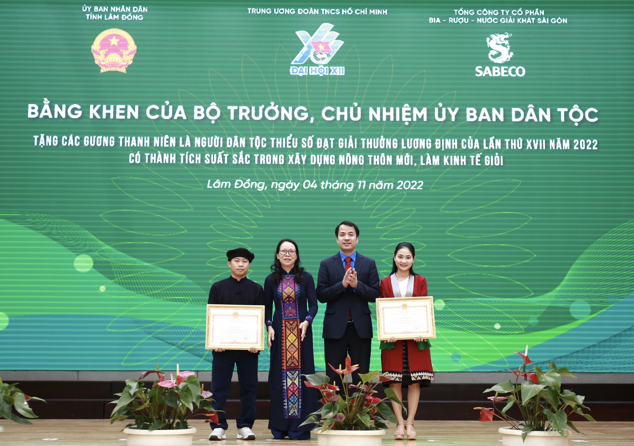 Đồng chí Hoàng Thị Hạnh - Thứ trưởng, Phó Chủ nhiệm Ủy ban Dân tộc và đồng chí Ngô Văn Cương - Bí thư TƯ Đoàn, Chủ nhiệm Ủy ban Kiểm tra TƯ Đoàn tặng Bằng khen cho 2 cá nhân là thanh niên người dân tộc thiểu số đạt Giải thưởng Lương Định Của lần thứ XVII năm 2022 có thành tích xuất sắc trong xây dựng nông thôn mới, làm kinh tế giỏi