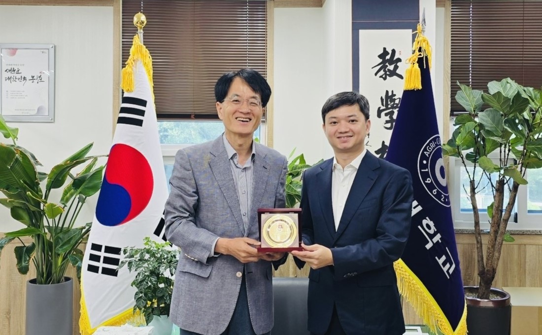 Tiếp đoàn có ngài Son Byung-hwan, Giám đốc - Hiệu trưởng Đại học Nonghyup và ngài Lee Sang-yeol, Giáo sư kiêm Viện trưởng Viện hợp tác trường học – doanh nghiệp Đại học Nonghyup.