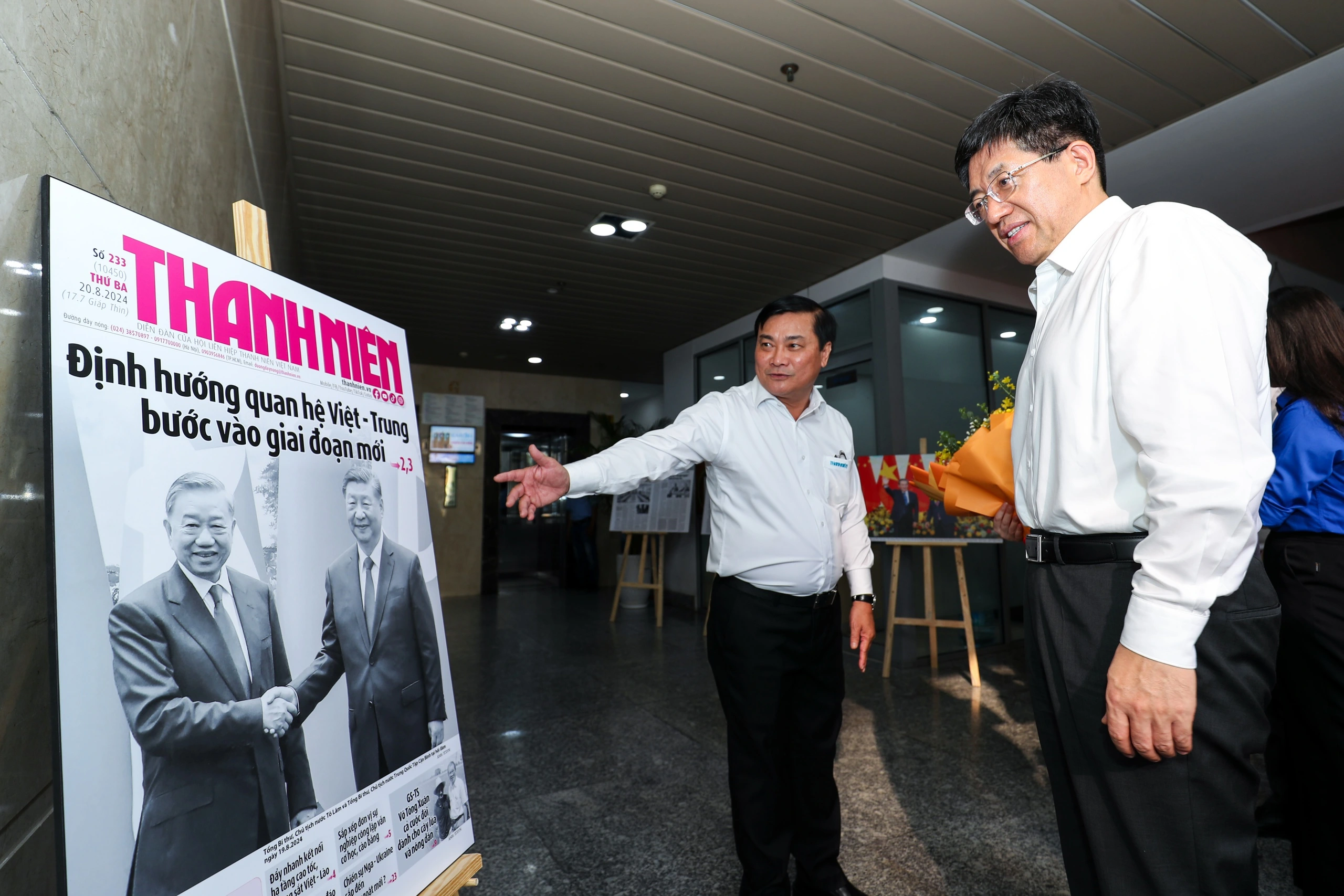 Đón tiếp đoàn, nhà báo Nguyễn Ngọc Toàn, Phó Chủ tịch Hội Liên hiệp thanh niên Việt Nam, Bí thư Đảng ủy, Tổng Biên tập Báo Thanh Niên gửi lời chào mừng nồng nhiệt nhân dịp được vinh dự đón các đại biểu Đoàn TNCS Trung Quốc thăm tòa soạn Báo Thanh Niên.
