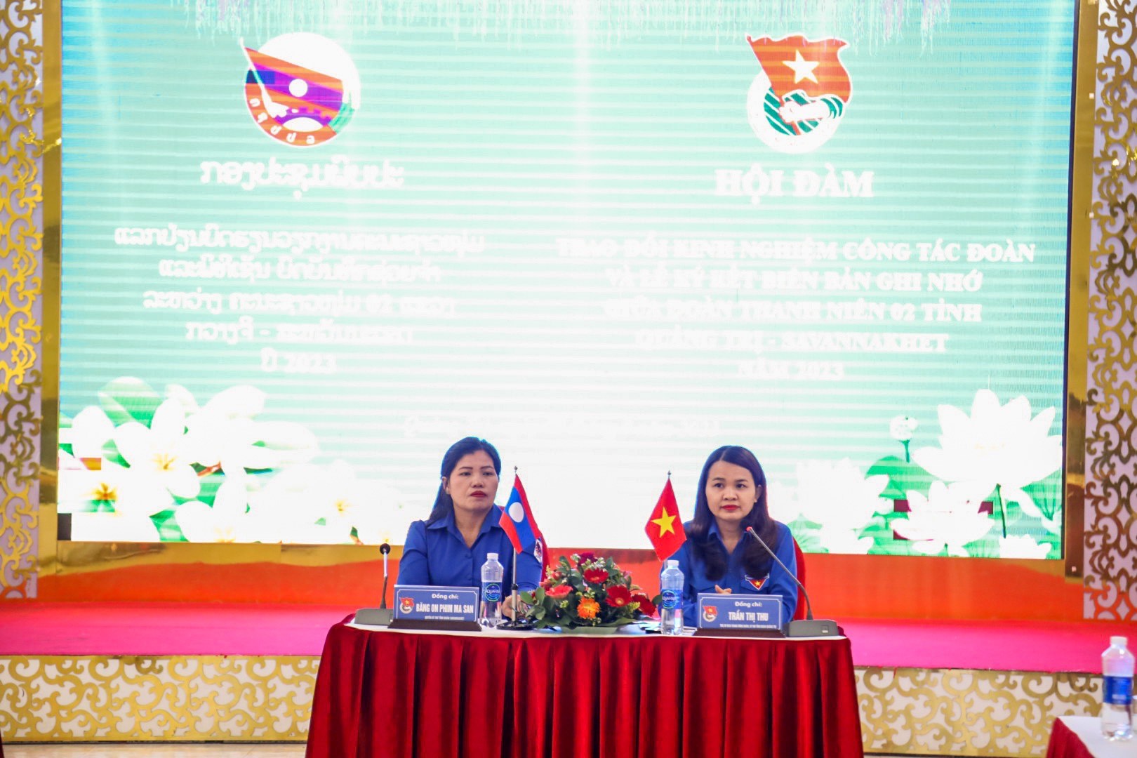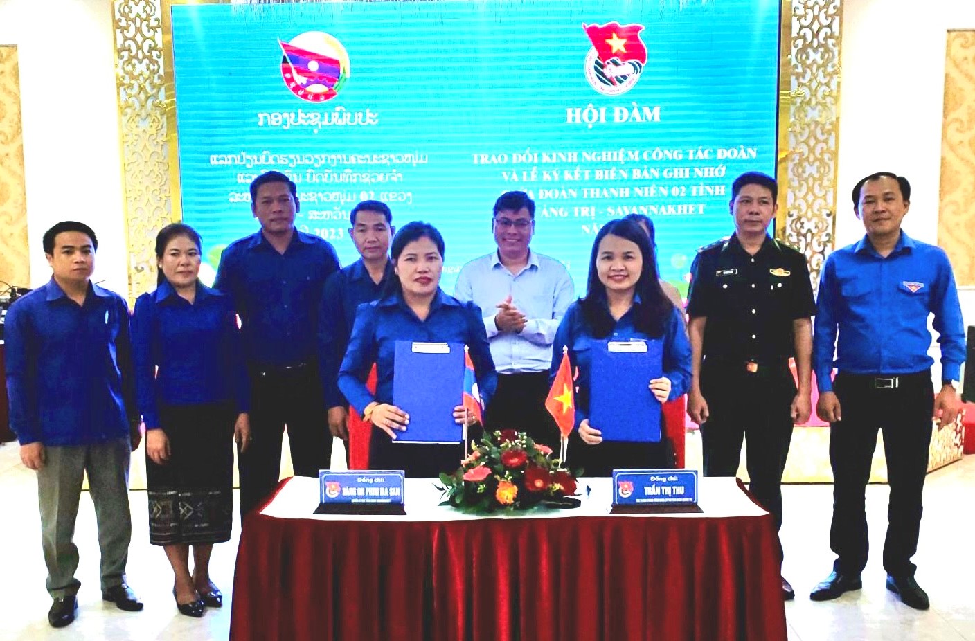 Đồng chí Trần Thị Thu - Tỉnh ủy viên, Ủy viên BCH Trung ương Đoàn, Bí thư Tỉnh Đoàn Quảng Trị và đồng chí Băng On Phim Mạ Son, Quyền Bí thư Ban Chấp hành Đoàn TNNDCM Lào tỉnh Savannakhet cùng chủ trì Hội đàm.
