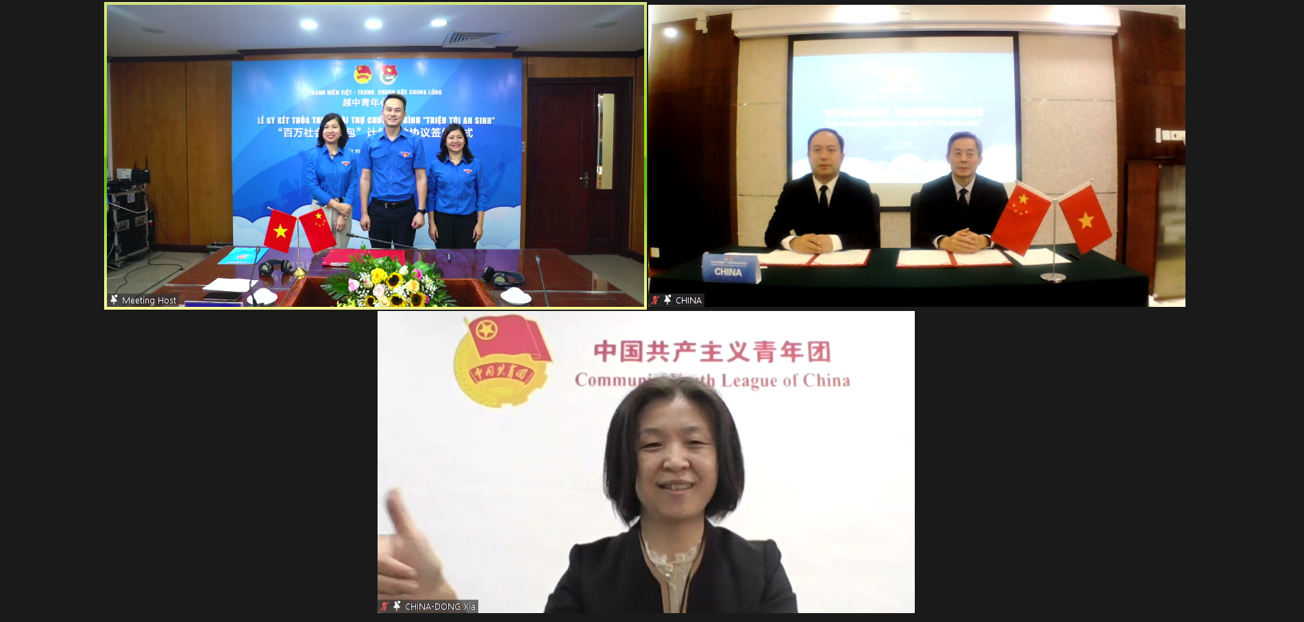 Thay mặt Trung ương Đoàn TNCS Hồ Chí Minh, Trung ương Hội Liên hiệp thanh niên Việt Nam, đồng chí Trịnh Thị Mai Phương - Quyền Trưởng Ban Quốc tế Trung ương Đoàn, Phó Chủ tịch Hội Liên hiệp thanh niên Việt Nam trân trọng gửi lời cảm ơn chân thành tới đồng chí Hạ Quân Khoa, Bí thư thứ nhất Ban Bí thư Trung ương Đoàn TNCS Trung Quốc, các đồng chí lãnh đạo, cán bộ Trung ương Đoàn TNCS Trung Quốc, Hội LHTN toàn Trung Quốc, Quỹ sáng nghiệp lập nghiệp thanh niên Trung Quốc, các bạn đoàn viên, thanh niên Trung Quốc đã dành sự ủng hộ quý báu, kịp thời cho chương trình “Triệu túi an sinh” của Trung ương Đoàn TNCS Hồ Chí Minh.