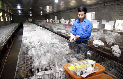 Đoàn viên Nguyễn Văn Nhanh đang theo dõi chăm sóc đàn thỏ - đây là mô hình đang mang lại hiệu quả kinh tế cao cho gia đình anh