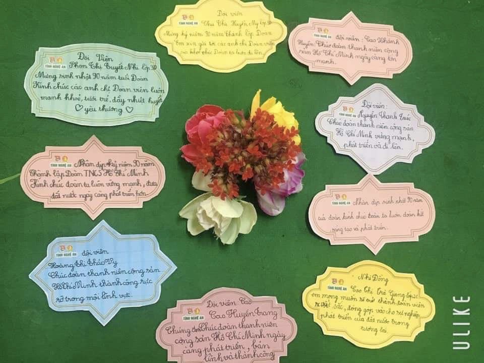 Đối với các em Đội viên, Thiếu niên nhi đồng, thực hiện lời dạy của Bác Hồ "Tuổi nhỏ làm việc nhỏ, tùy theo sức của mình", những dòng chữ đáng yêu, mang chút ngây thơ, trong sáng được gửi gắm qua từng bức thư, bài viết, bài báo tường hay từng chiếc thiệp handmade được cắt dán công phu, tỉ mỉ đó là lời khẳng định niềm tin sắt son với Đoàn, lời hứa sẽ chăm ngoan, học giỏi, phấn đấu để trở thành người Đoàn viên Đoàn TNCS Hồ Chí Minh, ước mơ được khoác trên mình chiếc áo xanh tình nguyện thắm màu tuổi trẻ.