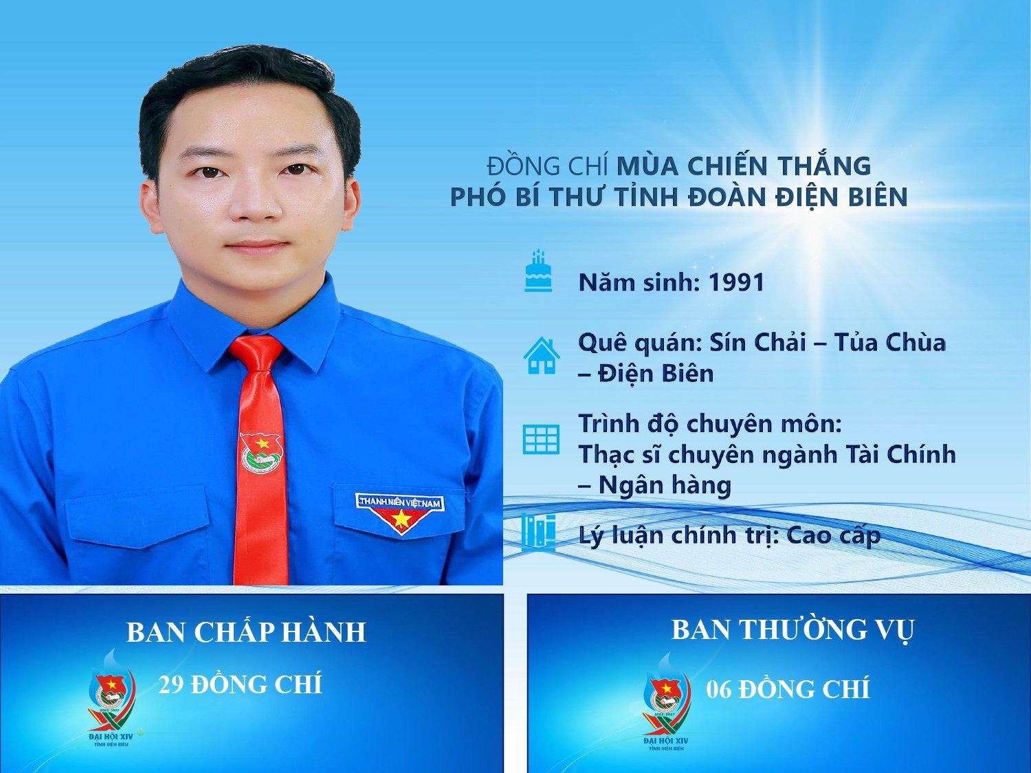 Đồng chí Đặng Thành Huy - Bí thư Tỉnh Đoàn Điện Biên khóa XIII, nhiệm kỳ 2017 - 2022, được tín nhiệm bầu làm Bí thư Tỉnh Đoàn khóa XIV, nhiệm kỳ 2022 – 2027. Đồng chí Mùa Chiến Thắng, Phó Bí thư Tỉnh Đoàn khóa XIII cũng được tín nhiệm bầu làm Phó Bí thư khóa XIV, nhiệm kỳ 2022-2027.