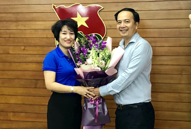Đồng chí Nguyễn Anh Tuấn, Phó Bí thư thường trực Đảng ủy cơ quan Trung ương Đoàn chúc mừng đồng chí Lê Hồng Hạnh
