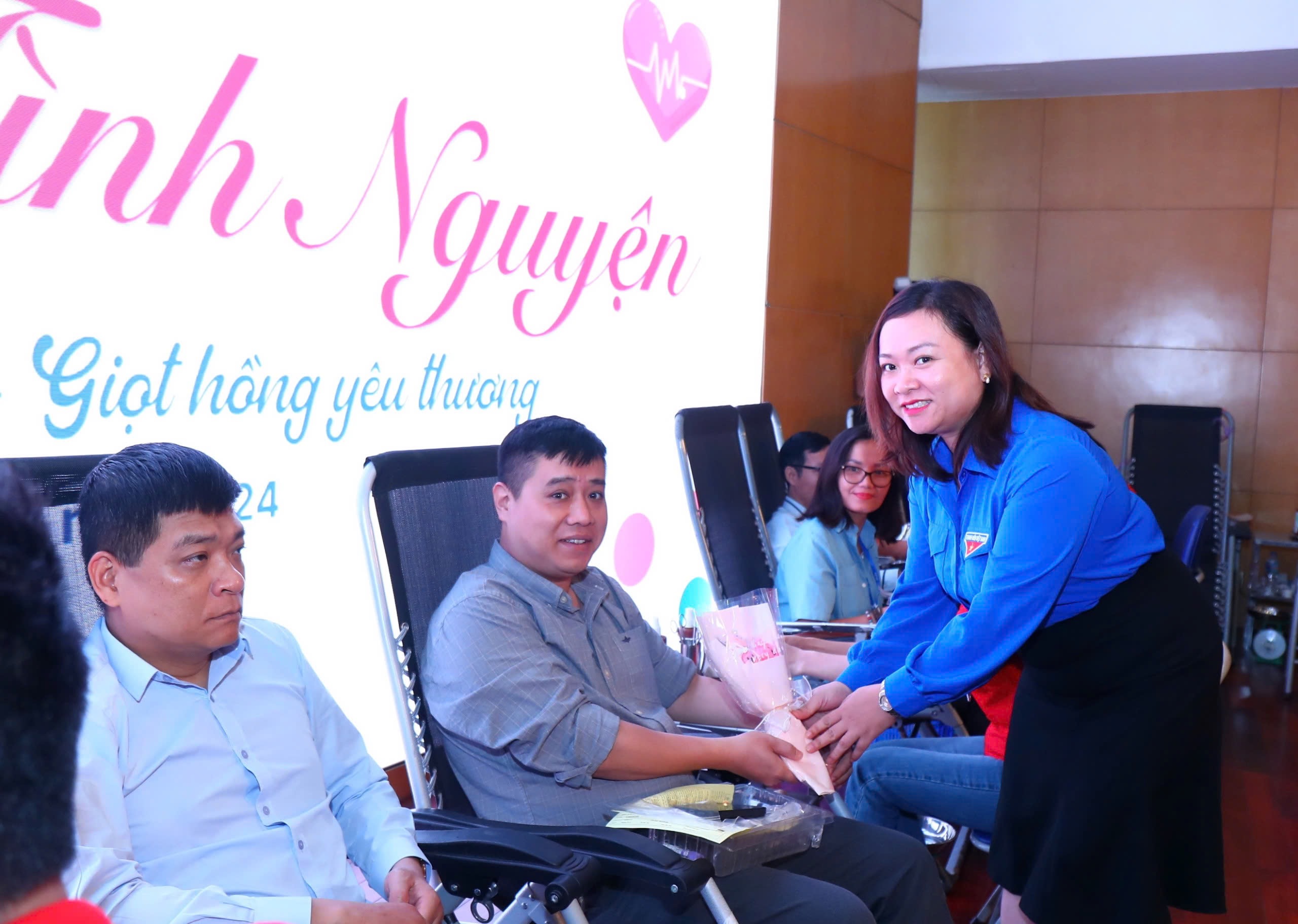 Đồng chí Trần Thị Ngọc Quỳnh, Phó Bí thư thường trực Đoàn khối Doanh nghiệp Trung ương tặng hoa cho đoàn viên thanh niên tham gia hiến máu
