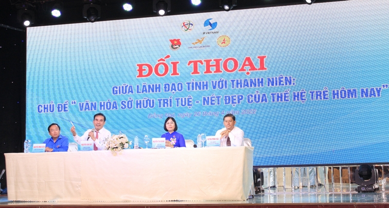 Chủ trì buổi đối thoại có các đồng chí: Nguyễn Thị Hoàng - Tỉnh ủy viên, Phó Chủ tịch UBND tỉnh; Nguyễn Văn Bảy - Phó Cục Trưởng, Cục Sở hữu trí tuệ; Huỳnh Minh Hậu - Phó Giám đốc Sở Khoa học và Công nghệ; Nguyễn Minh Kiên - Phó Bí thư Tỉnh đoàn