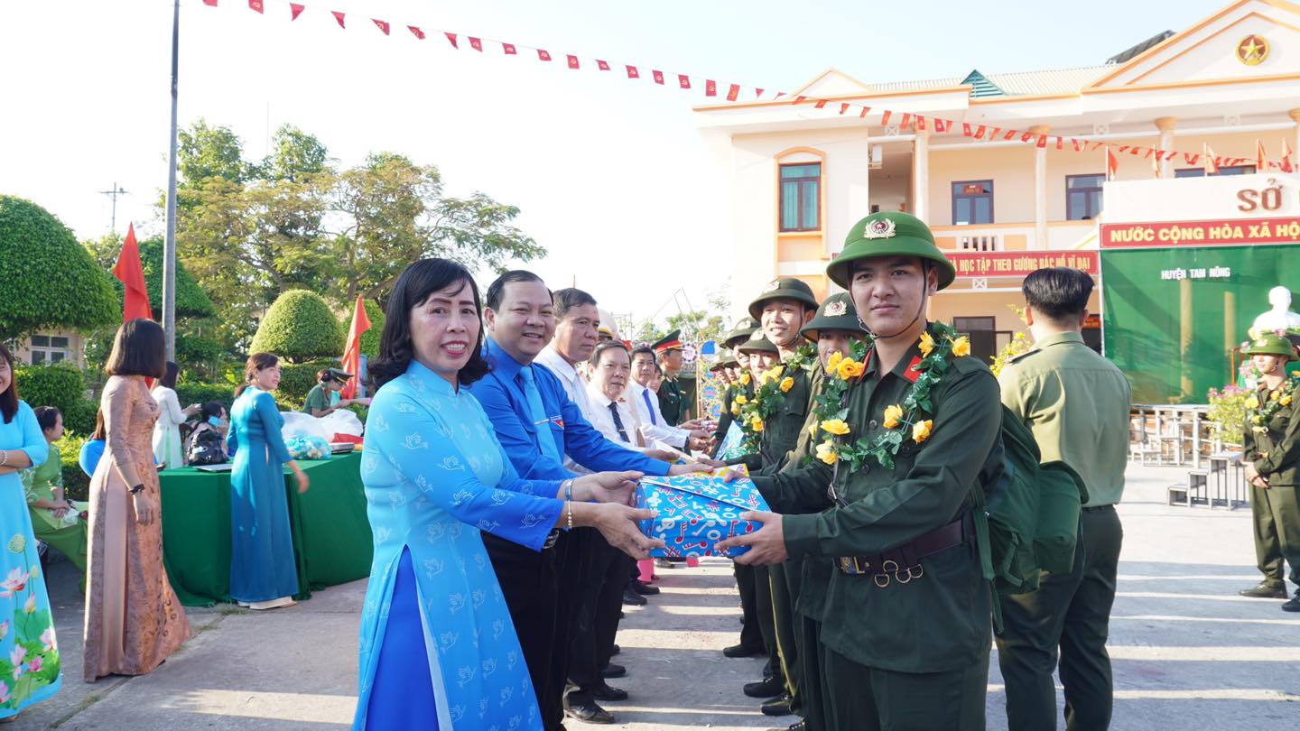 Đồng chí Lê Quốc Phòng, Ủy viên Trung ương Đảng, Bí thư Tỉnh ủy Đồng Tháp tặng hoa cho các tân binh lên đường nhập ngũ