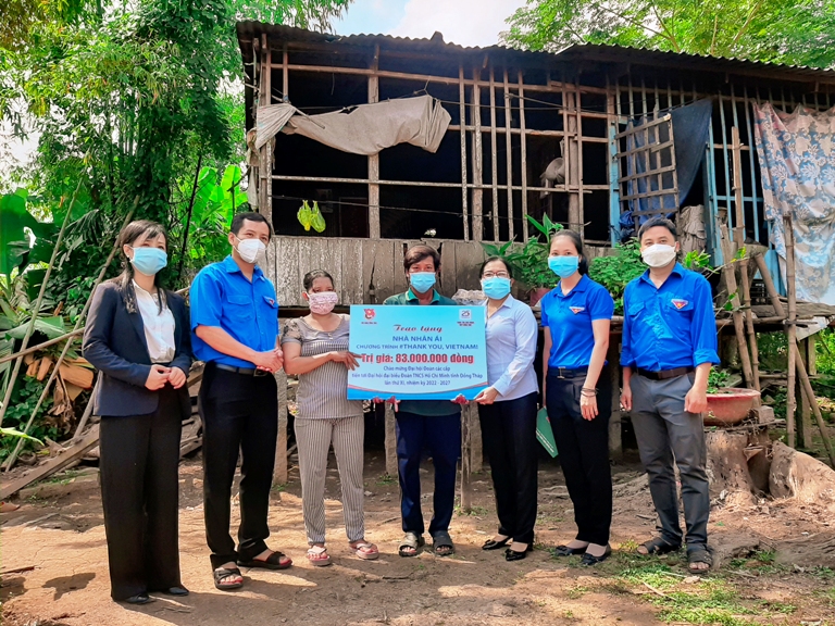 Ngày 13/01/2022, đoàn công tác do đồng chí Nguyễn Hoàng Minh Trí - Phó Bí thư tỉnh Đoàn làm trưởng đoàn cùng đồng chí Lê Nguyễn Thị Thu Trang - Trưởng phòng Bán hàng online đại diện Trung tâm kinh doanh VNPT Đồng Thápđã đến thăm và trao kinh phí xây dựng nhà nhân ái cho 05 hộ gia đình có hoàn cảnh khó khăn tại các huyện Tân Hồng, Hồng Ngự, Thanh Bình, Cao Lãnh với tổng kinh phí trao tặng là 415.000.000 đồng, trong đó mỗi căn trị giá 83.000.000 đồng trích từ nguồn quỹ chương trình #Thank you, VietNam! do Trung ương Đoàn TNCS Hồ Chí Minh và Tổng công ty Dịch vụ viễn thông (VNPT Vinaphone) phát động nhằm xây dựng nhà nhân ái giúp đỡ cho các gia đình có hoàn cảnh khó khăn trên khắp Việt Nam.