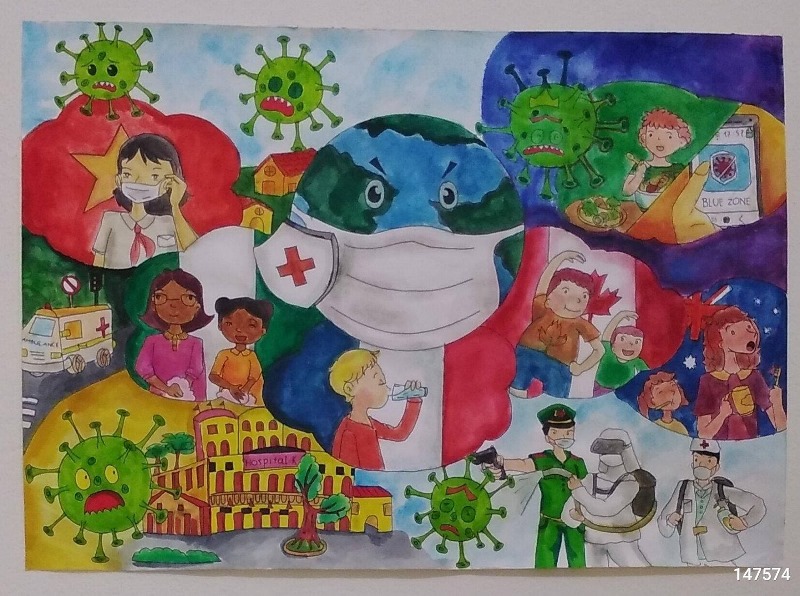 Lee Yun Woo,cho biết: “Cuộc thi có chủ đề thật gần gũi và thiết thực nên khi cô giáo thông báo về cuộc thi là em đã muốn tham gia ngay. Ở nhà, bố mẹ em cũng thường xuyên nhắc nhở chúng em về việc giữ gìn vệ sinh, an toàn phòng chống Covid và những nguy hiểm nếu không tuân thủ việc phòng dịch. Vì vậy, qua bức tranh, em muốn nhắn gửi đến các bệnh viện và các bác sĩ, cô chú nhân viên y tế và tất cả mọi người cũng đoàn kết chiến đấu và chiến thắng Covid”.