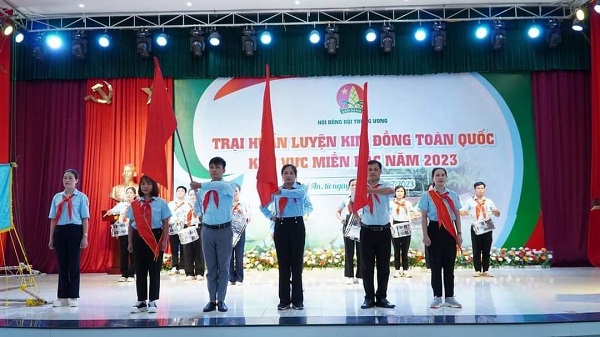 Tham gia trại huấn luyện Kim Đồng do TW Đoàn tổ chức (Cô Lê Thị Xoan là người cầm cờ ở giữa thực hiện nghi thức)