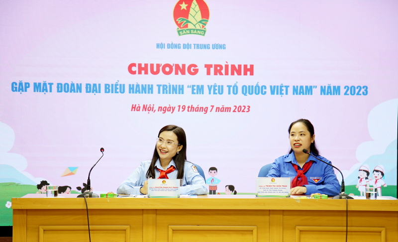 Đồng chí Nguyễn Phạm Duy Trang, Bí thư Trung ương Đoàn, Chủ tịch Hội đồng Đội Trung ương và đồng chí Trịnh Thị Hiền Trân - Ủy viên BCH T.Ư Đoàn, Phó Bí thư Thành đoàn, Chủ tịch Hội đồng Đội TP HCM chủ trì buổi gặp mặt
