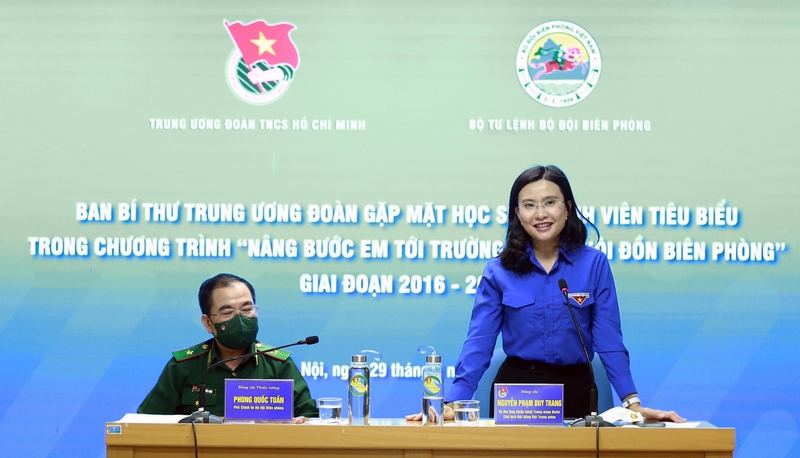 Phát biểu tại buổi gặp gỡ, đồng Nguyễn Phạm Duy Trang - Bí thư BCH Trung ương Đoàn, Chủ tịch Hội đồng Đội T.Ư đánh giá cao hiệu quả của chương trình "Nâng bước em đến trường - Con nuôi đồn biên phòng". Trong suốt thời gian qua, lực lượng Bộ đội Biên phòng không chỉ thực hiện nhiệm vụ chính trị giữ gìn và bảo vệ biên cương Tổ quốc mà còn đang thực hiện nhiều nhiệm vụ giúp đỡ nhân dân vùng biên trong việc ổn định cuộc sống, phát triển kinh tế..., tiêu biểu như chương trình "Nâng bước em đến trường - Con nuôi đồn biên phòng" rất ý nghĩa này.