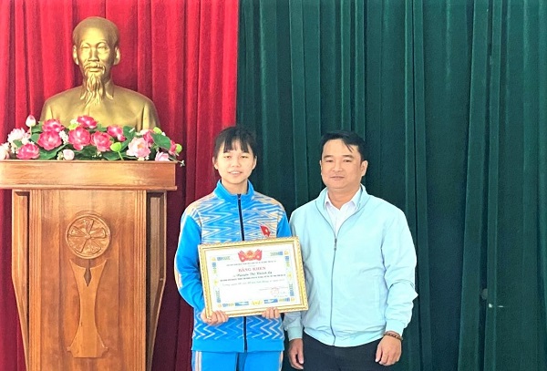 Anh Đỗ Duy Nam, Phó BT tỉnh đoàn tặng bằng khen cho VĐV Nguyễn Thị Khánh Ly đạt huy chương vàng tại Đại hội TDTT toàn quốc năm 2022