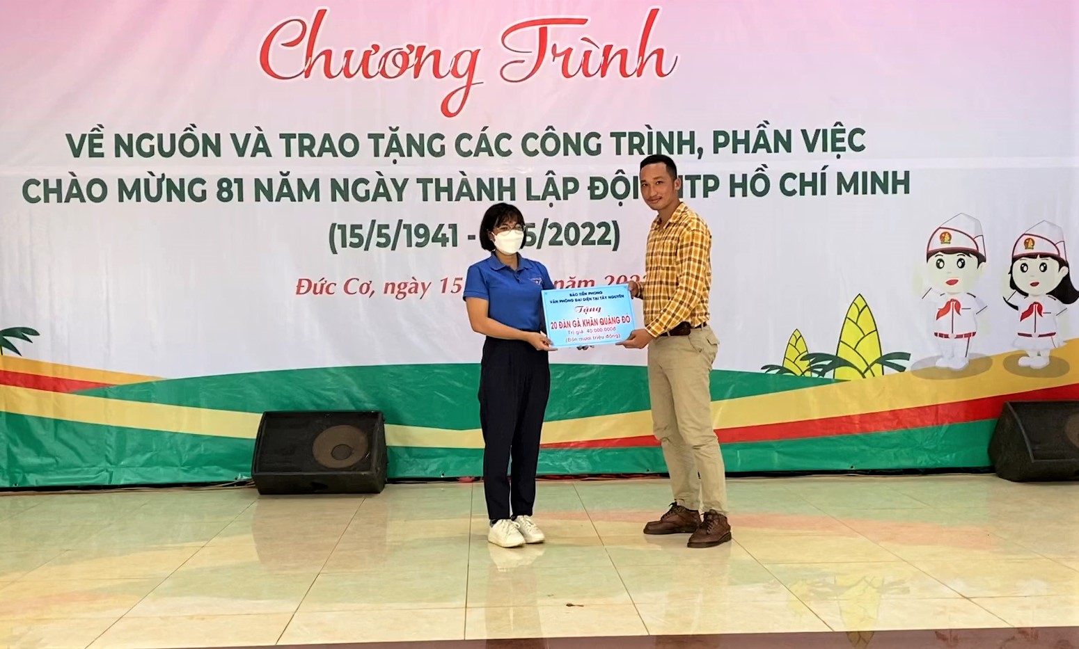 Đại diện Báo Tiền Phong tại Gia Lai trao bảng tượng trưng 20 đàn gà khăn quàng đỏ cho thiếu nhi huyện Chư Pưh