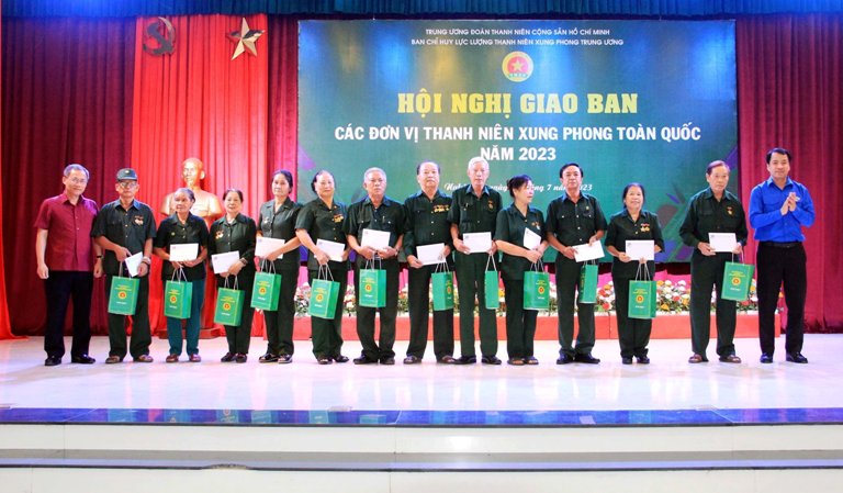 Đại diện Ban Bí thư Trung ương Đoàn và Bộ Nội vụ trao quà tới các cựu thanh niên xung phong. Ảnh: Thanh Quỳnh
