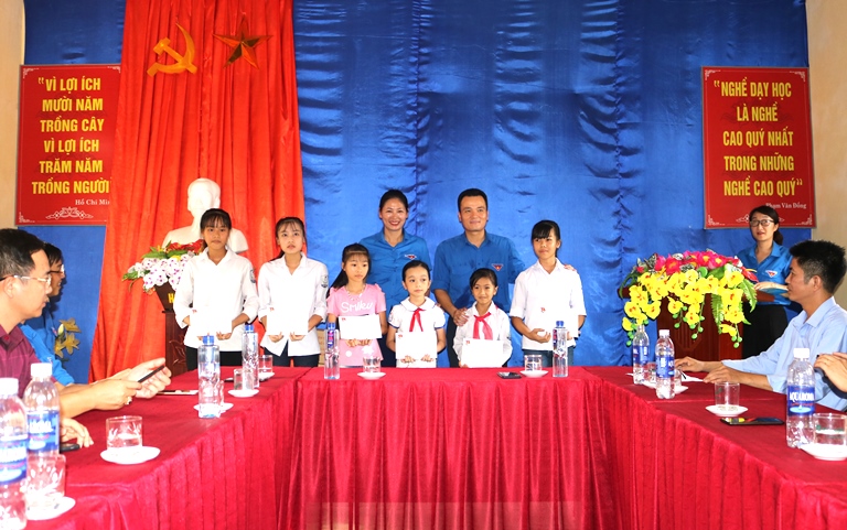 Bí thư Tỉnh đoàn Yên Bái Đoàn Thị Thanh Tâm và Bí thư Tỉnh đoàn Lào Cai Giàng Quốc Hưng trao học bổng cho các em học sinh nghèo vượt khó