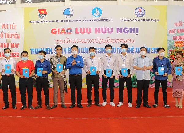 Tại Chương trình Ban Thường vụ Tỉnh đoàn, Hội LHTN tỉnh, Hội Sinh viên đã gửi đến đại diện các lưu HS Lào đang học tập tại trường Cao đẳng sư phạm Nghệ An lẵng hoa tươi thắm, đồng thời trao tặng 11 suất học bổng mỗi suất trị giá 500.000 đồng cho 11 bạn lưu học sinh Lào có thành tích học tập xuất sắc trong thời gian vừa qua. Uỷ ban Mặt trận Tổ quốc Việt Nam trao tặng 01 suất quà cho đại diện lưu học sinh Lào.