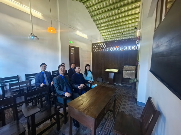 Đoàn đại biểu chụp ảnh tại lớp học, nơi Chủ tịch Hồ Chí Minh từng đào tạo các cán bộ cách mạng đầu tiên của Ta