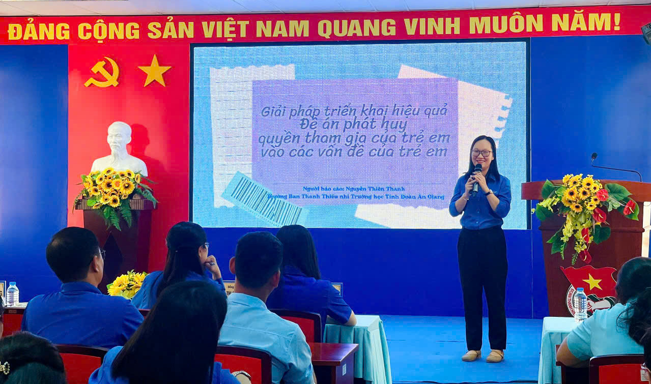 Đồng chí Nguyễn Thiên Thanh, Trưởng ban Thanh thiếu nhi trường học Tỉnh đoàn An Giang chia sẻ giải pháp triển khai hiệu quả Đề án phát huy quyền tham gia của trẻ em vào các vấn đề trẻ em