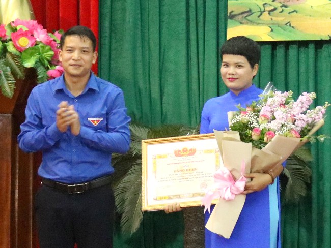 Đồng chí Thèn Văn Quân, Phó Bí thư Tỉnh đoàn trao tặng Bằng khen cho nhóm tác giả đạt giải Nhất