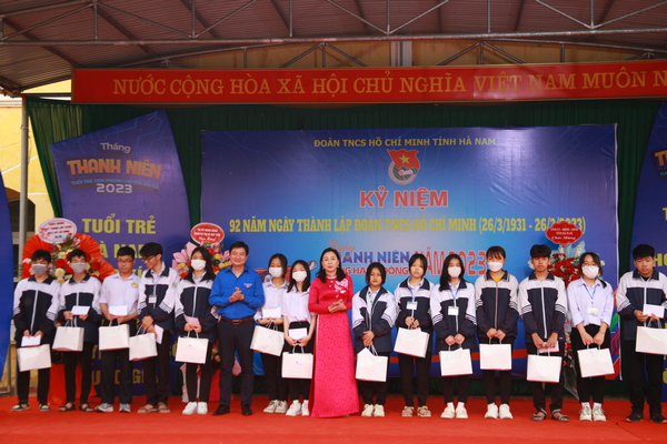Nhân dịp này, Ban Thường vụ Tỉnh đoàn Hà Nam đã trao Bằng khen cho 3 em học sinh Trường THCS Trịnh Xá, TP Phủ Lý đã có hành động cứu người đuối nước; tặng 30 suất quà cho học sinh có hoàn cảnh khó khăn của Trường THPT B Duy Tiên và tặng công trình số hóa thông tin di tích quốc gia đặc biệt chùa Long Đọi Sơn trị giá 200 triệu đồng cho Thị đoàn Duy Tiên.