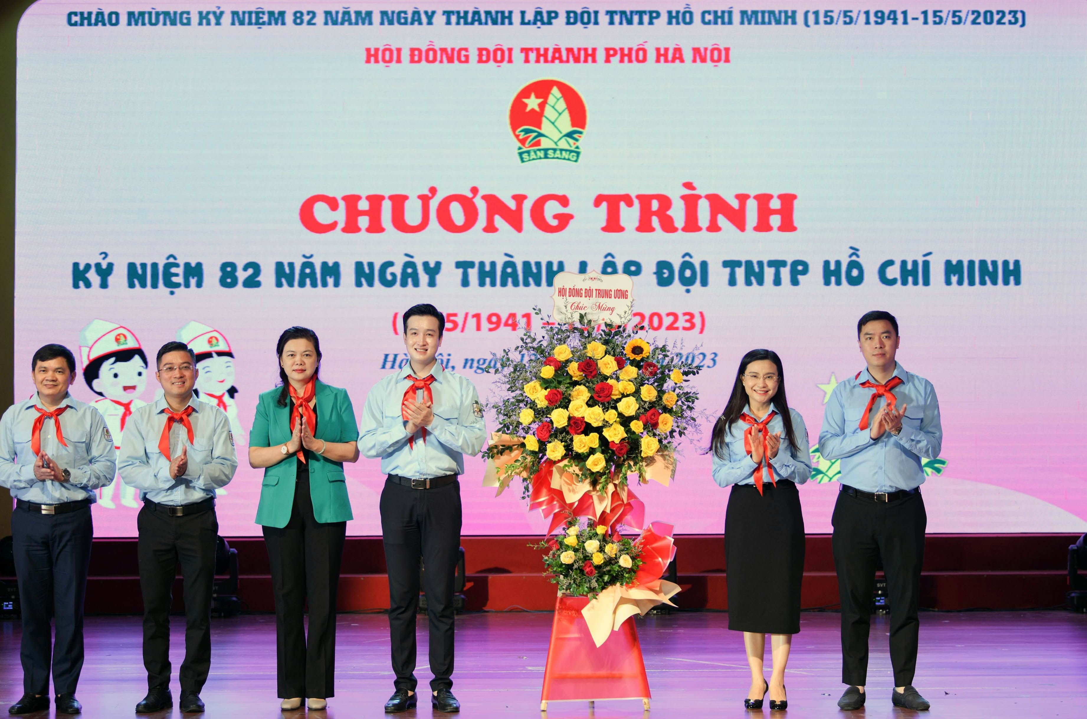 Đồng chí Nguyễn Phạm Duy Trang, Bí thư Trung ương Đoàn, Chủ tịch Hội đồng Đội Trung ương tặng hoa chúc mừng Hội đồng Đội thành phố Hà Nội