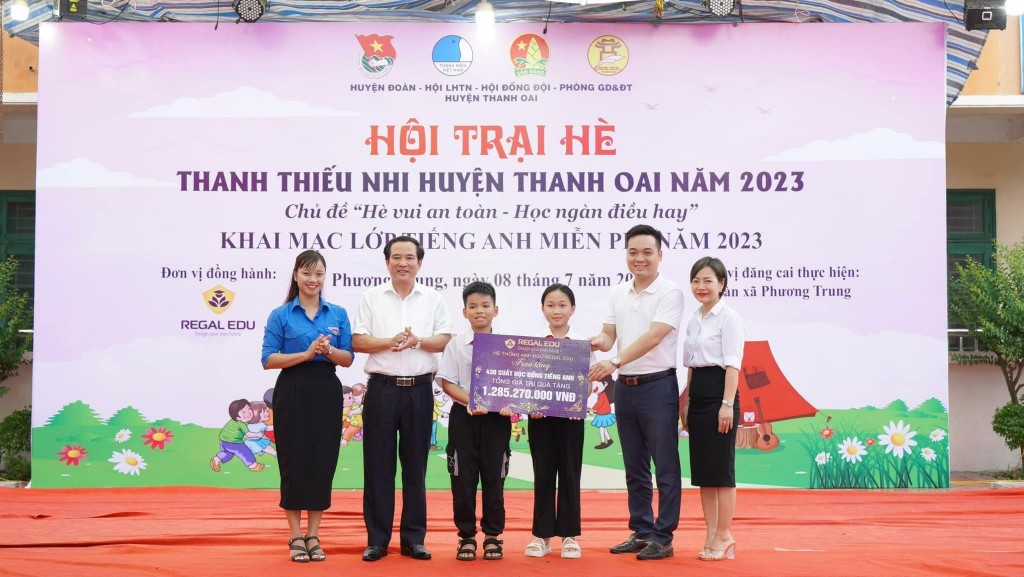 Chị Nguyễn Thị Minh Nguyện, Bí thư Huyện đoàn Thanh Oai cho biết: “Nhằm nâng cao năng lực tiếng Anh cho thiếu nhi, Hội đồng Đội - Phòng GD&ĐT huyện phối hợp với Hệ thống Anh ngữ Regal Edu tổ chức chương trình dạy Tiếng Anh miễn phí cho thiếu nhi trên địa bàn. Theo đó các em thiếu nhi đã được trao tặng 430 suất học tiếng Anh với tổng trị giá hơn 1 tỷ đồng”.