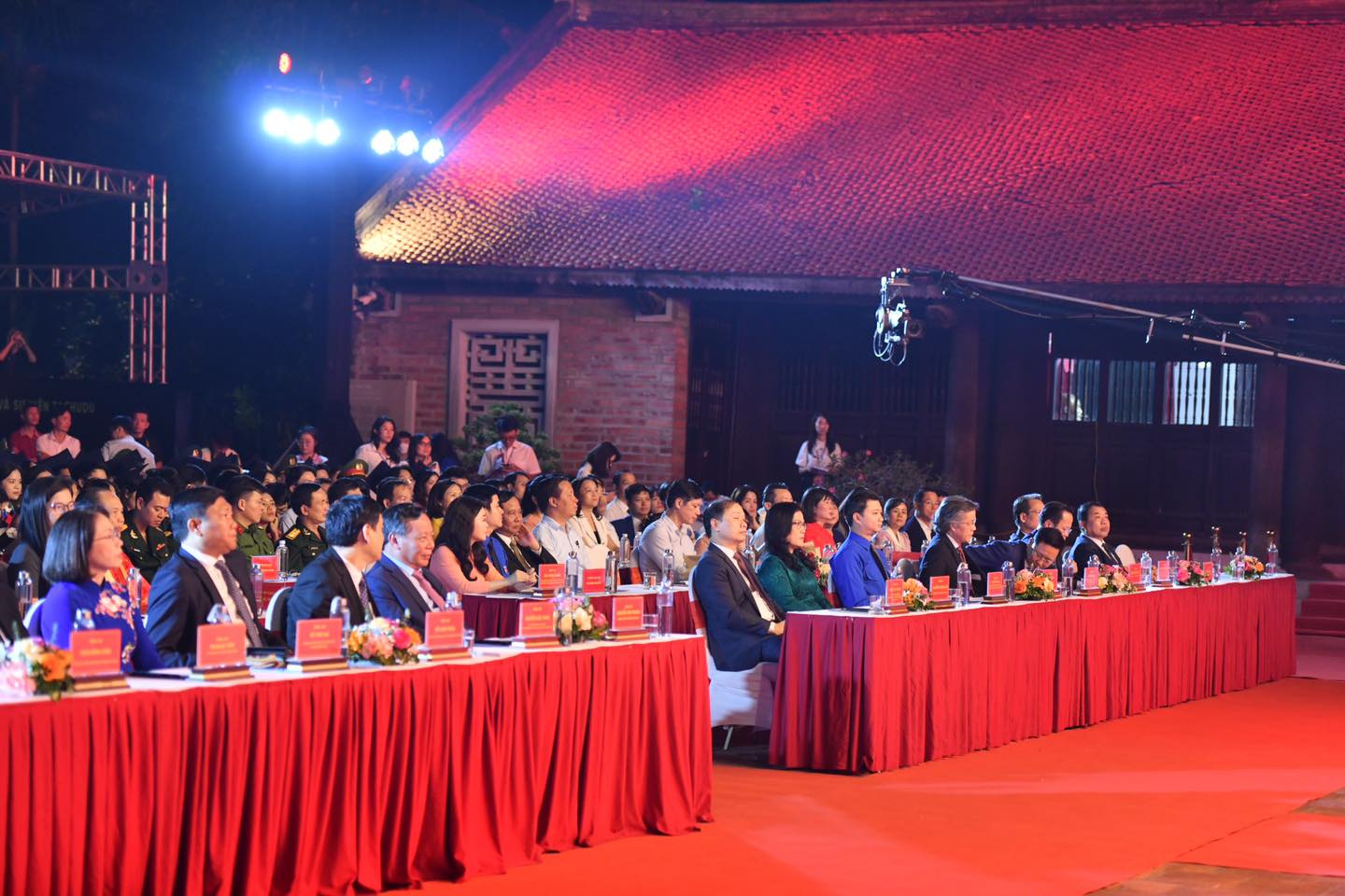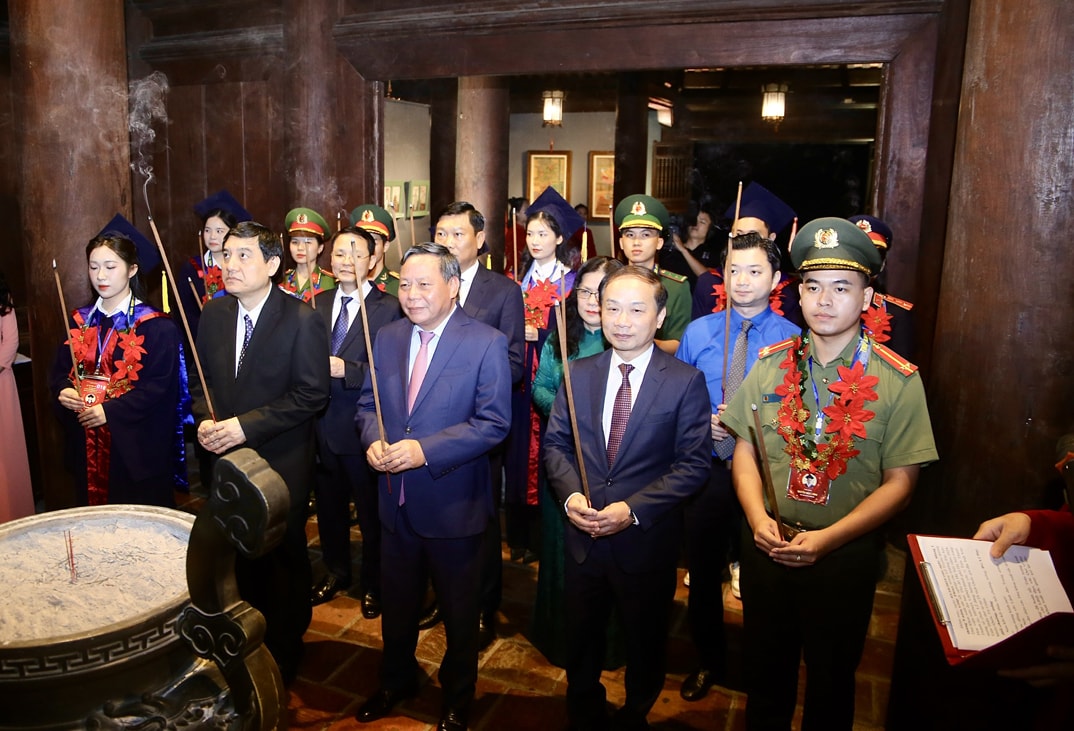 Trước khi vào lễ tuyên dương, các đồng chí lãnh đạo Trung ương, thành phố Hà Nội cùng đại diện thủ khoa xuất sắc đã dâng hương tại Nhà Thái học, Di tích Quốc gia đặc biệt Văn Miếu - Quốc Tử Giám.