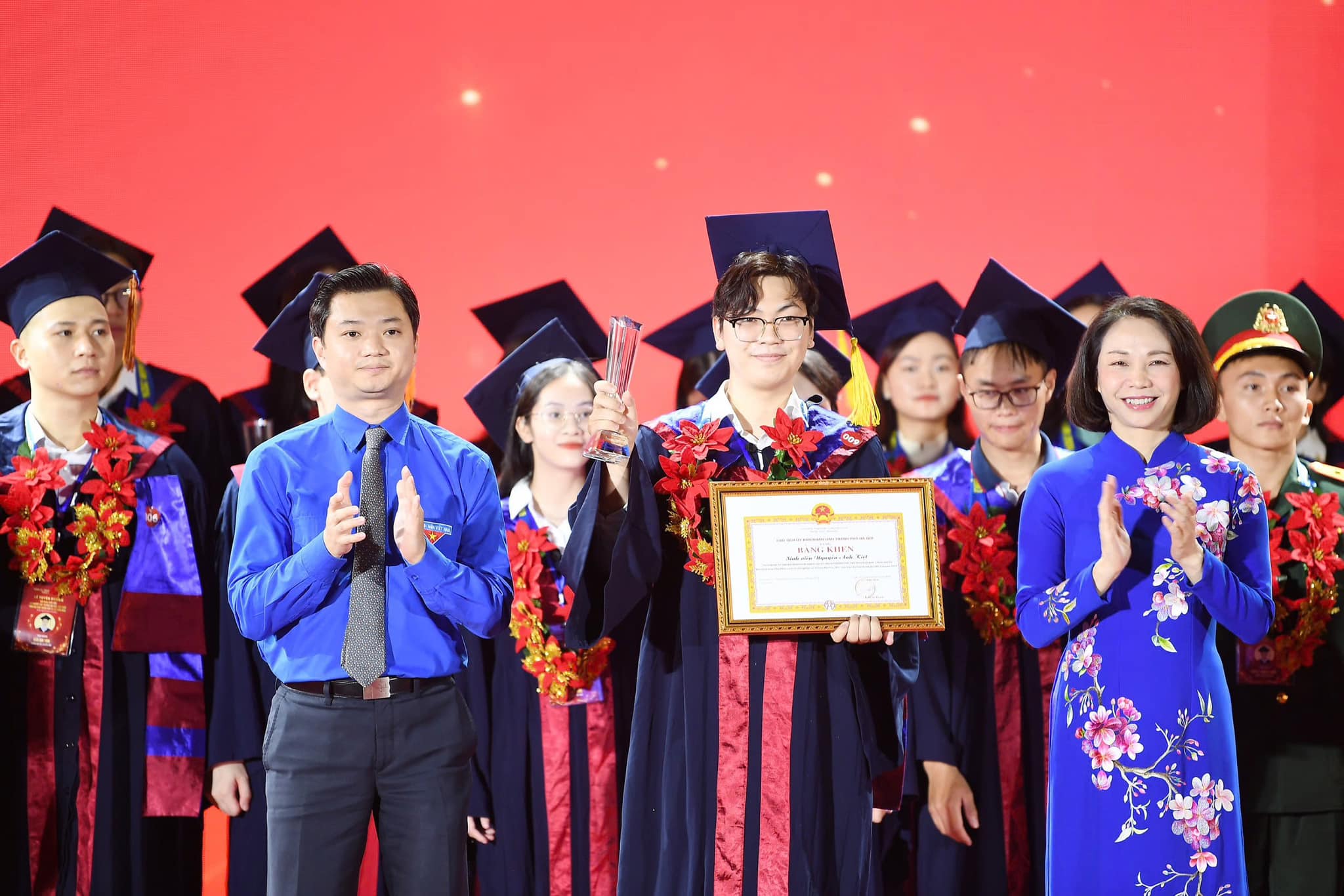 Bí thư Trung ương Đoàn Nguyễn Minh Triết và Phó Chủ tịch UBND Thành phố Hà Nội Vũ Thu Hà trao Bằng khen thủ khoa xuất sắc