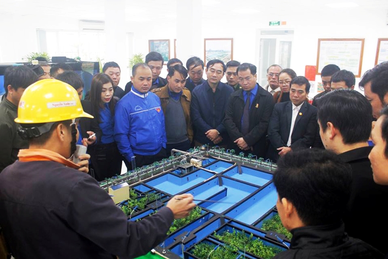 Các đại biểu theo dõi cán bộ kỹ thuật của công ty Fomosa Hà Tĩnh trình bày quy trình xử lý nước thải