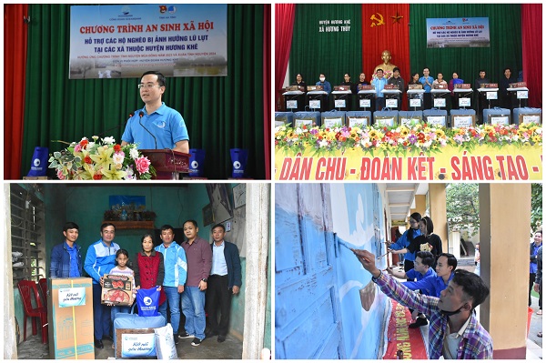 Theo đó, tại huyện Hương Khê, Tỉnh Đoàn, Hội LHTN Việt Nam tỉnh phối hợp với các đơn vị: Công đoàn Ngân hàng OceanBank, Trung tâm Kỹ thuật sản xuất chương trình VTV, Quỹ Dâu Tây, tập đoàn Velacorp, Công ty Acecook Việt Nam trao tặng gần 180 suất quà cho các hộ dân bị ảnh hưởng bởi lũ lụt tại xã các xã Hà Linh, Hương Thuỷ, Hương Giang, Điền Mỹ với tổng trị giá gần 320 triệu đồng, đồng thời trang trí tranh tường bích hoạ, tạo không gian vui chơi, giải trí cho các em học sinh tại trường mầm non Hà Linh.