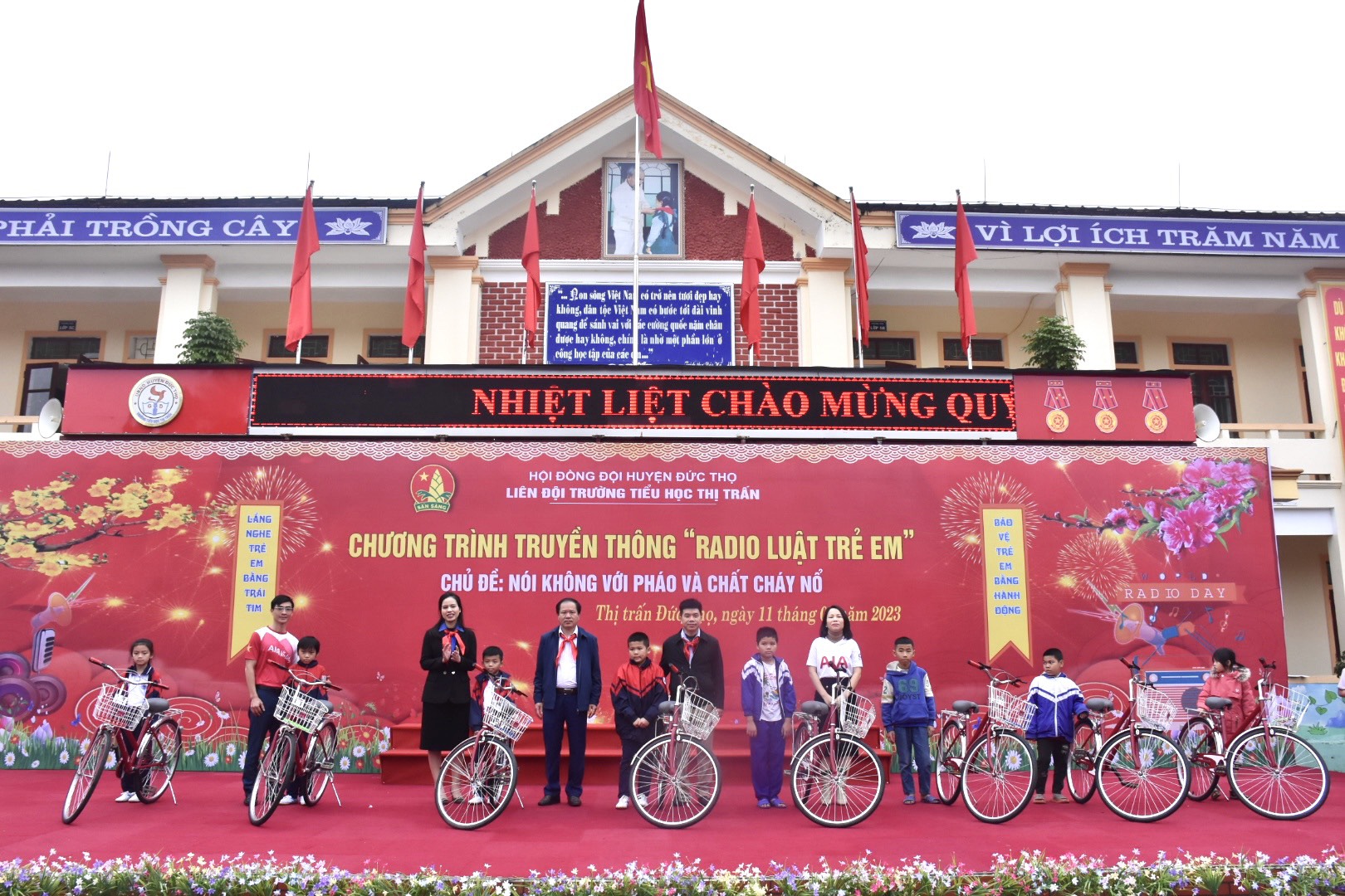 Cũng trong khuôn khổ chương trình, các đại biểu đã tham dự hoạt động “Radio luật trẻ em” của Liên đội Trường Tiểu học Thị trấn Đức Thọ. Đây là mô hình sáng tạo nhằm tuyên truyền sâu rộng Luật trẻ em đến các gia đình, cộng đồng và giúp thiếu nhi tiếp cận, hiểu rõ hơn về Luật trẻ em năm 2016 cũng như vai trò của các bậc phụ huynh trong chăm sóc và giáo dục trẻ em. Tại chương trình, Hội đồng Đội tỉnh và các đơn vị phối hợp cũng đã trao 10 xe đạp và 24 suất quà trị giá gần 30 triệu đồng cho các trẻ em nghèo có hoàn cảnh đặc biệt khó khăn tại huyện Đức Thọ đồng thời giới thiệu Hành trình về nguồn, đưa học sinh tham quan, trải nghiệm kết hợp trao tặng nguồn lực hưởng ứng Chương trình “Kế hoạch nhỏ - Góp viên gạch hồng” đóng góp tôn tạo Khu Chứng tích Trường Cấp II Hương Phúc, huyện Hương Khê.