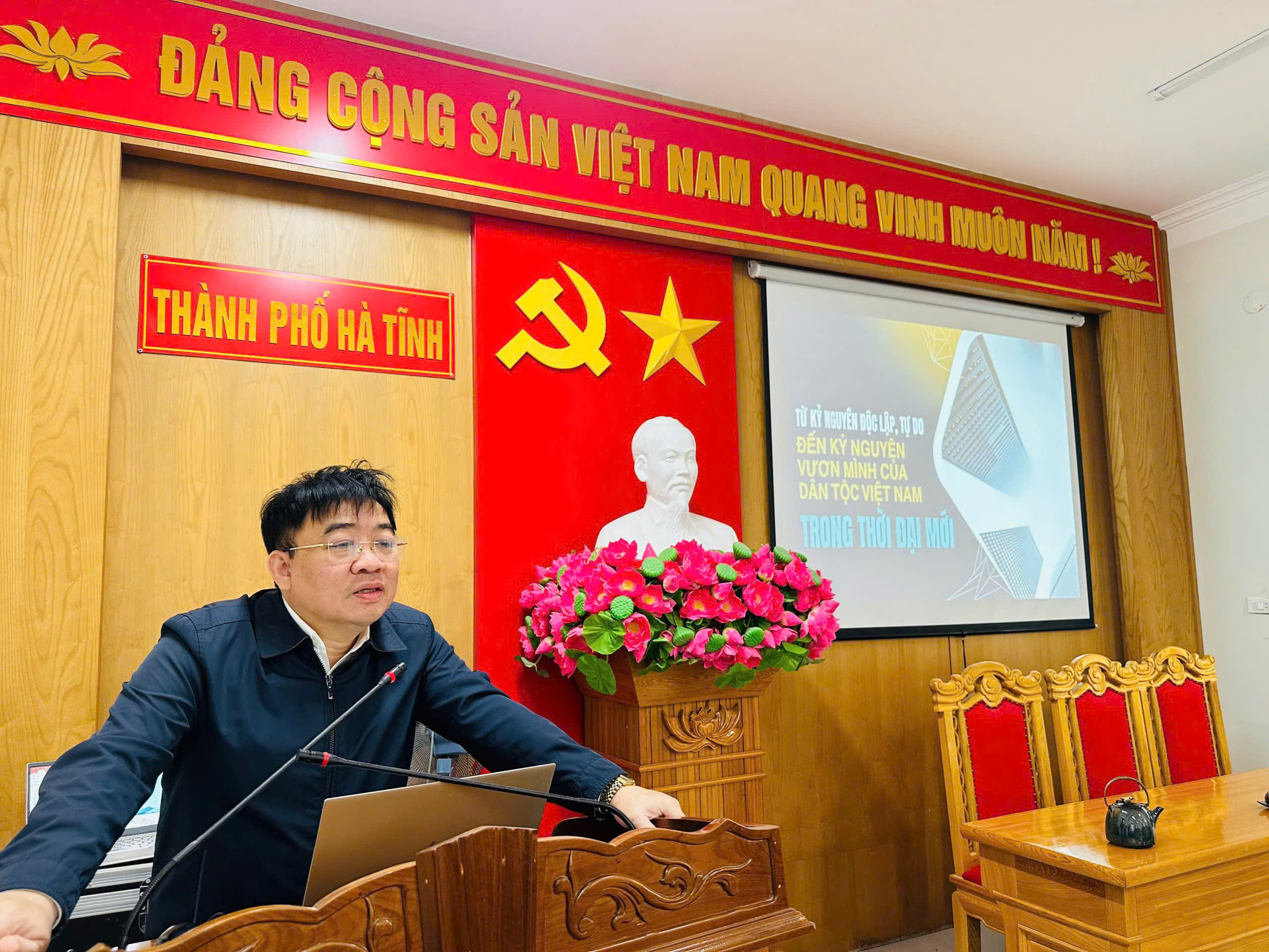 Đồng chí Trần Hậu Tuấn, Ủy viên Ban Thường vụ Thành uỷ, Trưởng ban Tuyên giáo và Dân vận Thành ủy, Giám đốc Trung tâm Chính trị Thành phố trao đổi, chia sẻ chuyên đề "Từ kỷ nguyên độc lập, tự do đến kỷ nguyên vươn mình của dân tộc Việt Nam trong thời đại mới"