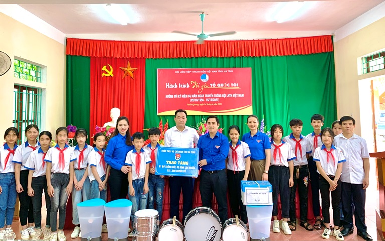 Tỉnh đoàn Hà Tĩnh trao tặng 01 bộ trống Đội, 03 bình lọc nước và 1000 quyển vở cho trường Tiểu học và THCS Nhân Mục, huyện Hàm Yên, tỉnh Tuyên Quang.