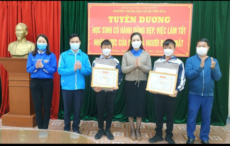 Đồng chí Nguyễn Ny Hương - Phó Bí thư Tỉnh Đoàn, Chủ tịch Hội đồng Đội tỉnh và đoàn công tác đã thay mặt Ban Thường vụ Tỉnh Đoàn, Hội đồng Đội tỉnh trao Bằng khen của Ban Chấp hành Tỉnh Đoàn cho hai em: Trịnh Minh Tài và Trịnh Minh Đức - Đội viên Lớp 7A Trường THCS Yên Hòa, huyện Cẩm Xuyên vì đã có hành động đẹp: Nhặt được của rơi, trả lại người đánh mất.