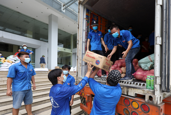 Đoàn viên, thanh niên và lực lượng tình nguyện viên tham gia hỗ trợ bốc xếp và vận chuyển nhu yếu phẩm hỗ trợ vùng dịch