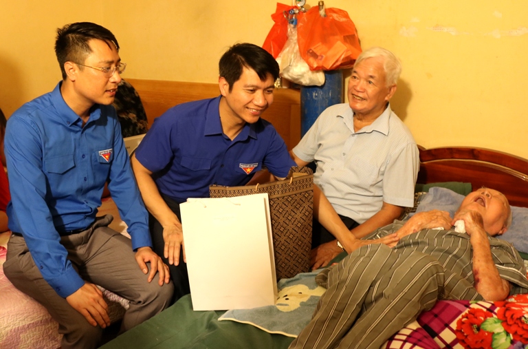 Anh hùng lực lượng vũ trang nhân dân Lê Thanh Đạo, nguyên Bí thư thứ hai Ban Chấp hành Trung ương Đoàn, Chủ tịch Hội Đồng Đội khóa đầu tiên (áo trắng); đồng chí Nguyễn Ngọc Lương thăm gia đình cựu chiến binh Hà Ngọc Bảo