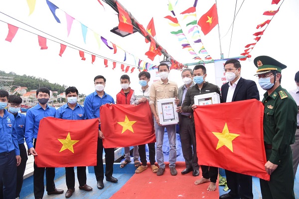 Tỉnh đoàn - Hội Sinh viên tỉnh tặng 200 cờ Tổ quốc và 05 tủ thuốc cho ngư dân trẻ bám biển tại cảng Quỳnh Phương